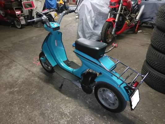 Mein Up&Over-Auspuff ist ein Original Zubehörteil aus der Zeit, welches es damals wohl nur in Italien zu kaufen gab. Ich habe ihn vor ein paar Jahren auf dem Teilemarkt in Novegro gefunden. Er war schon damals richtig teuer...