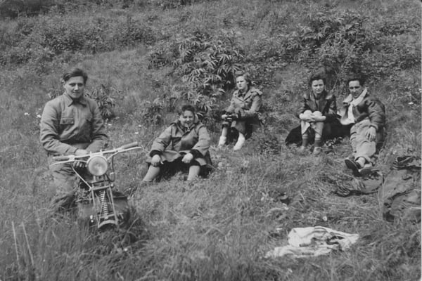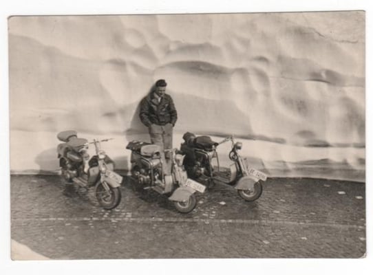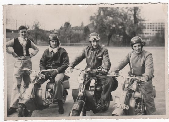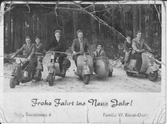 Das erste Bild zeigt James Künzi auf der Lambretta A beim "1. Rally Suisse a Milano" 1949 als erster von links durch Milano flitzen.