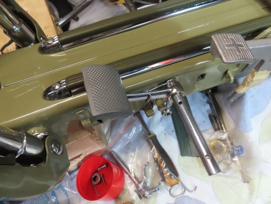 Ca. 1959 schlussendlich sieht man sie in der Werkstatt von James Künzi nur noch auf dem Regal stehen (5. Maschine von links; etwas versteckt) und offensichtlich besserer Zeiten harren.